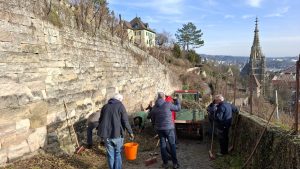 Auch in diesem Jahr beteiligten sich knapp 30 Freiwillige an der Putzaktion, um die Wege entlang des Felsenweges und des Hauptweges bis zur Frauenkirche zu reinigen. Sie folgten dem Aufruf des Staffelsteigervereins. Wir haben uns sehr gefreut, dass sich von der Ankündigung in der “Esslinger Zwiebel” auch Nichtmitglieder angesprochen gefühlt haben und fleissig mitgeholfen haben. So wurden die Besen schnell knapp. Mehrere Traktoren mit Anhängern sowie Trimmer und Freischneider kamen zum Einsatz, um die Mauern von Efeu und anderem Gestrüpp freizulegen und die Ränder entlang der Strecke zu säubern. Auch Reste des Silvestermülls, Flaschen, Glasscherben, Papierschnipsel, leider auch unzählige Hundekotbeutel, landeten in den Putzeimern.